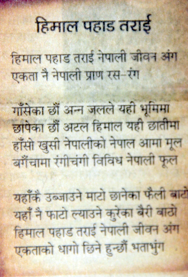 ‘पहिला पनि गीत लेखिबक्सन्थ्यो,’ शाहका निकट सहयोगी फणी पाठकले भने, ‘२०६५ जेठ २९ मा सत्ताबाट हटिबक्सेपछि लेखेको यो नै पहिलो गीत हो ।’ उनले मुलुकको सामयिक स्थिति महसुस गरी गीत लेखेका छन् । जसमा विभिन्न जातजातिबीचको एकता र मुलुकको अखण्डता केन्द्रमा राखिएको छ ।