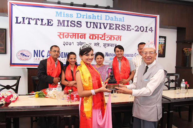 टर्कीको मिलासस्थित केफालुका रिसोर्टमा अघिल्लो हप्ता सम्पन्न ‘लिटिल मिस वल्र्ड युनिभर्स’ प्रतियोगिताको शीर्ष उपाधि विजेता नेपाली चेली दृष्टि दाहाललाई उनी अध्ययनरत विद्यालय एनआईसी एकेडेमीले सम्मान गरेको छ । राजधानीको डिल्लीबजारमा रहेको विद्यालयले उनलाई सम्मानसँगै निःशुल्क अध्ययन गराउने घोषणा पनि गरेको छ । १२ वर्षिया दृष्टि विद्यालयमा कक्षा ८ मा अध्ययनरत छिन् ।